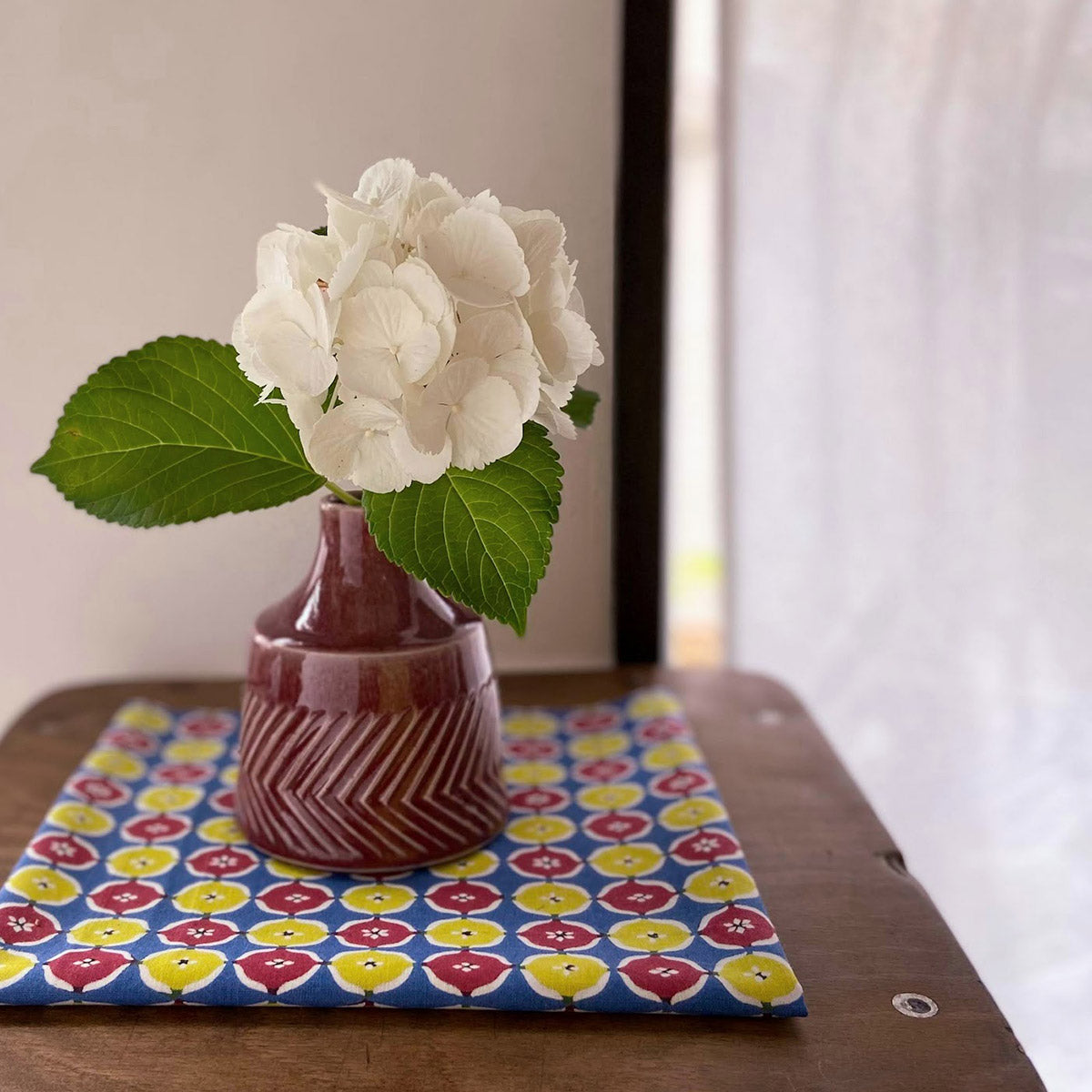 色同士がにじんで、同じ柄でもそれぞれが微妙に違う見え方の一点もの。一期一会の模様を作り出します。