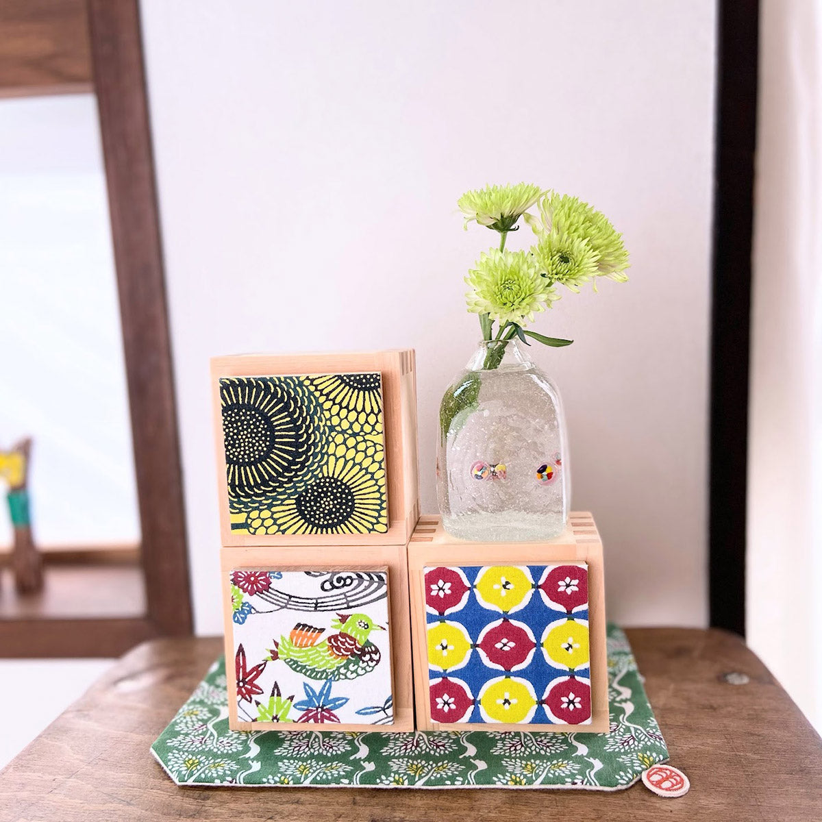 一合升のフレームに、フタのファブリックが1枚の絵になるように見立てたアートブロック。