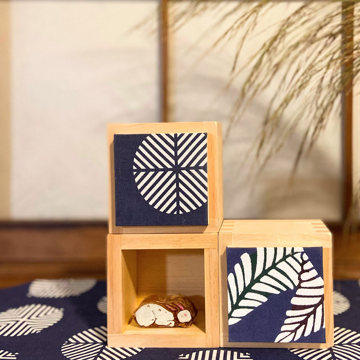 一合升のフレームに、フタのファブリックが1枚の絵になるように見立てたアートブロック。