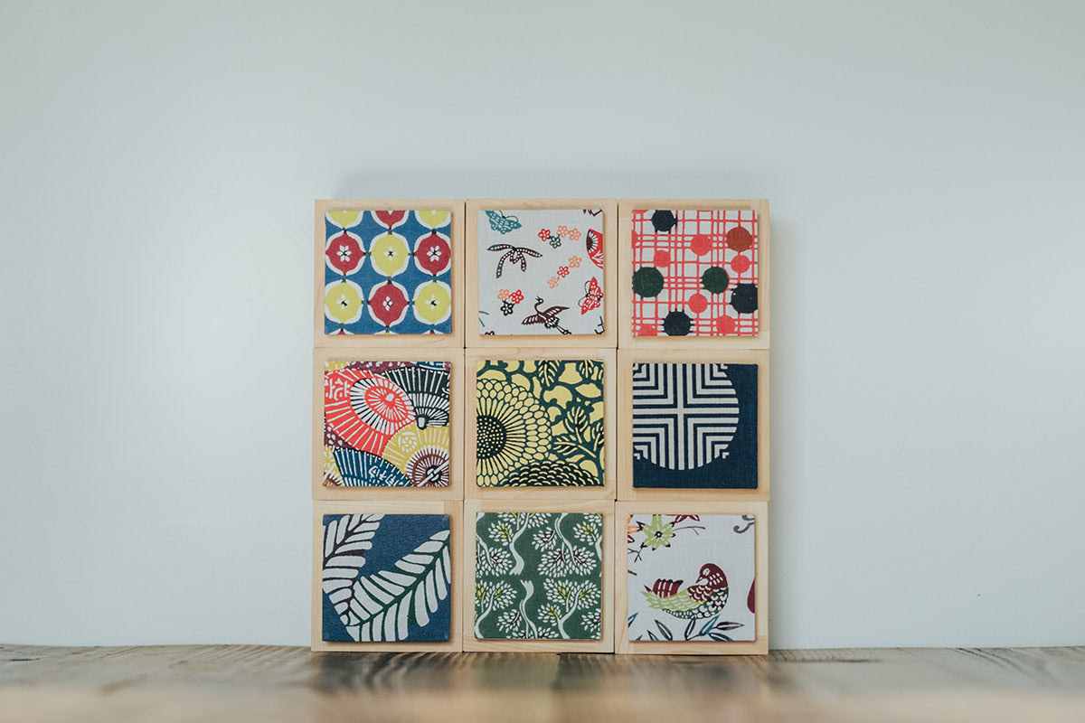 一合升のフレームに、フタのファブリックが1枚の絵になるように見立てたアートブロック。