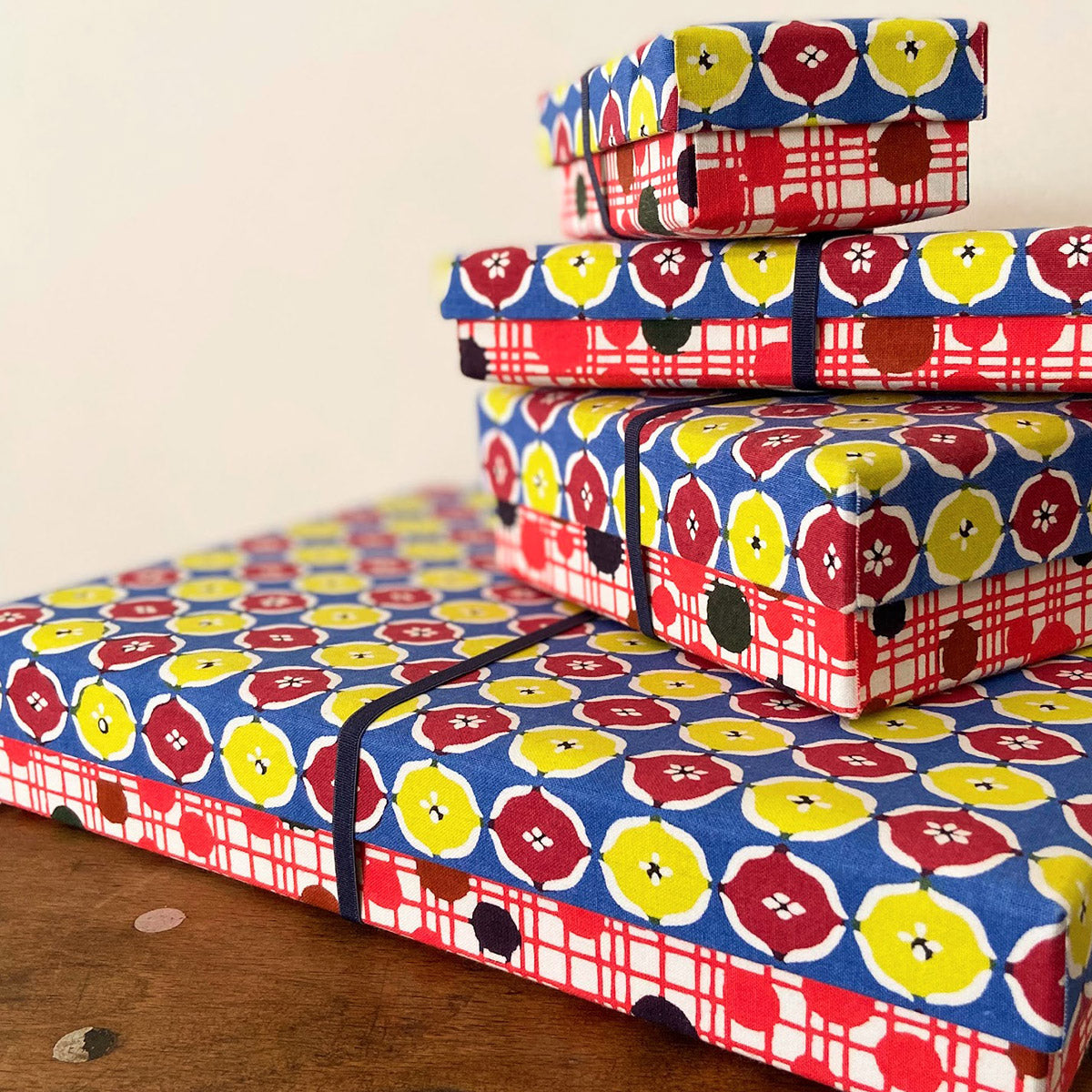 フタの柄と、ハコの柄が違う、にぎやかなコンビネーションに気持ちが高まるデザインで、内側もツートーンのカラーリング。